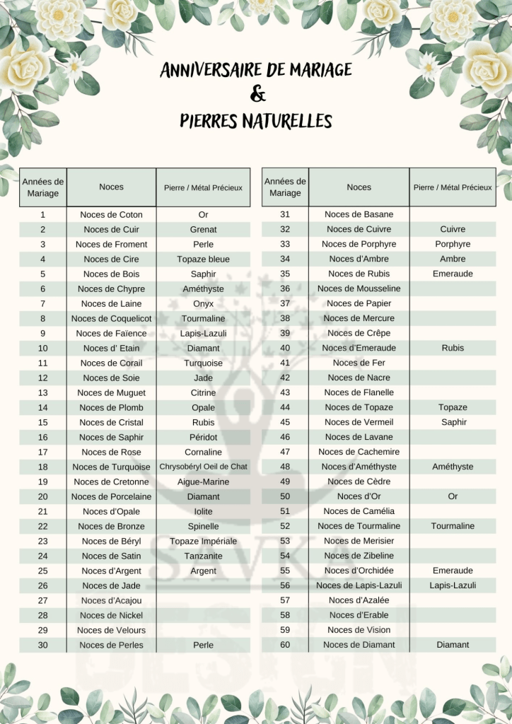 Dans le tableau ci-dessous, nous vous proposons de découvrir pour chaque année de mariage les pierres associées à celles-ci.